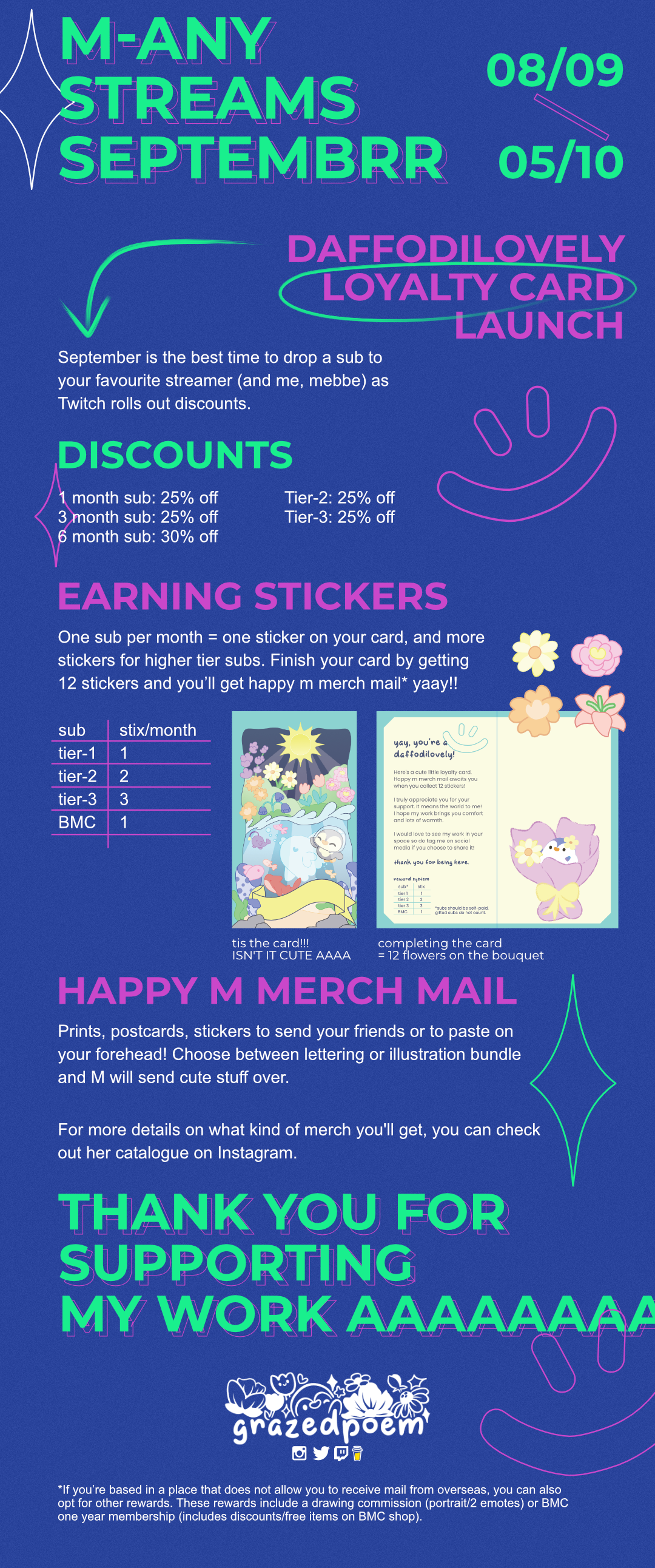 I also conduct raffles and giveaways for illustrations for server members first on my Discord server, before releasing them as 'your character here' (YCH) commissions on my Kofi/Buymeacoffee page. I recognise that my members also includes other streamers who might need assets for their media library to be used for stream, event posters and other related things, so organising raffles allow for them to use those assets if they get picked, and in turn, spread good word about my work when they use those assets.