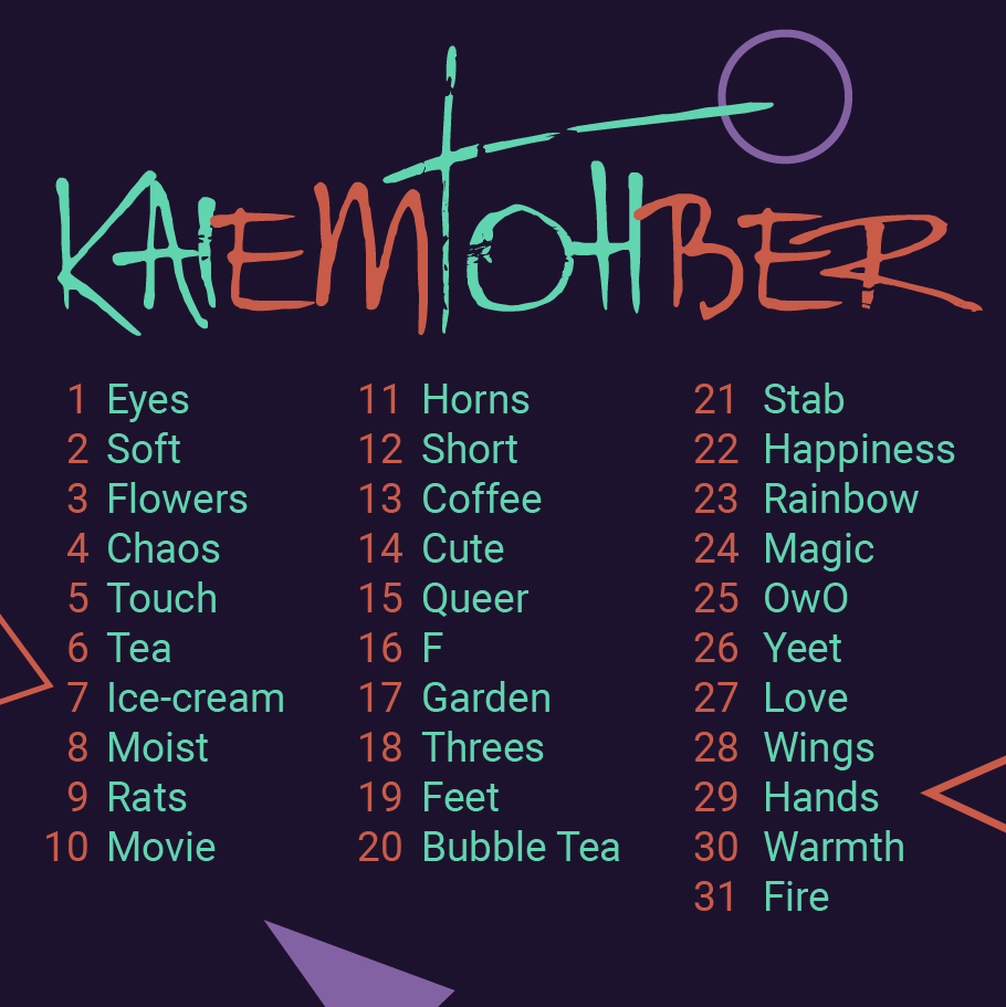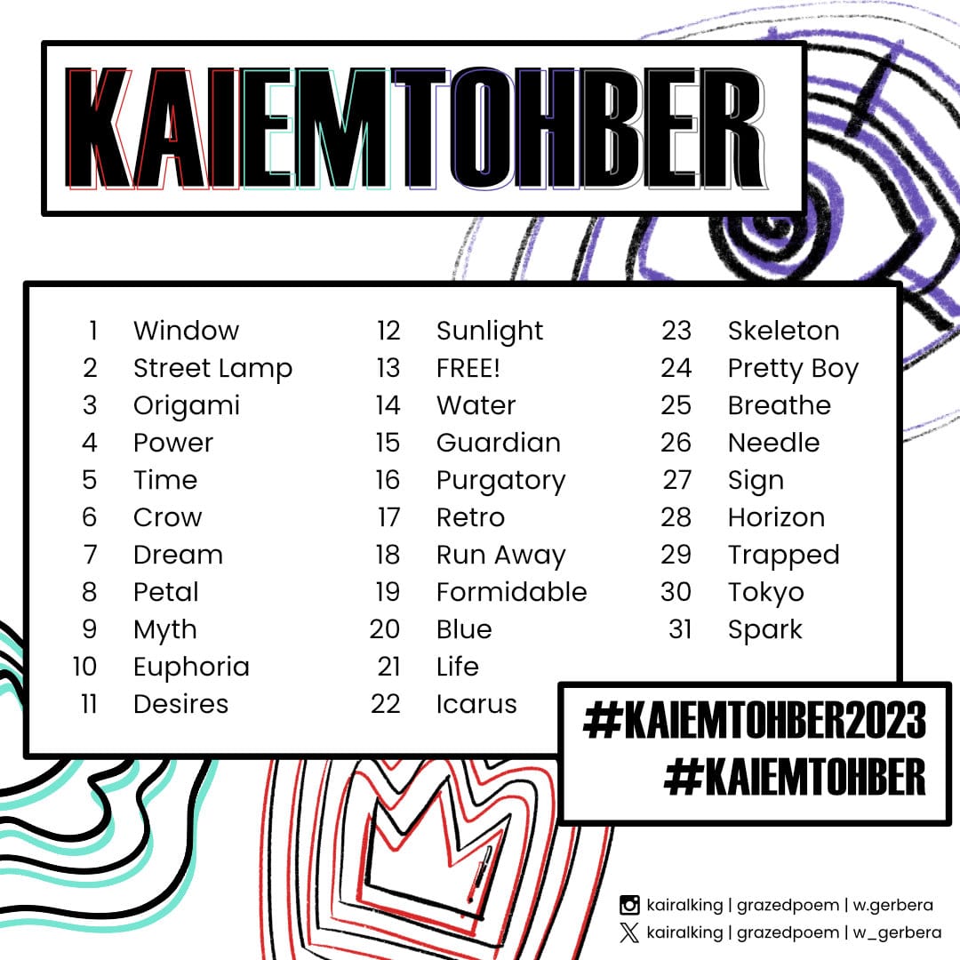 KaiEmTohber is an Inktober-inspired project by Kai (KairalKing/Kaithebox), Em (grazedpoem) and Tohma (monoTohma/w_gerbera), where we collectively brainstorm prompts for the monthly October challenge. Our promptlist is shared with our respective communities to encourage creative work based on the prompts for each day.