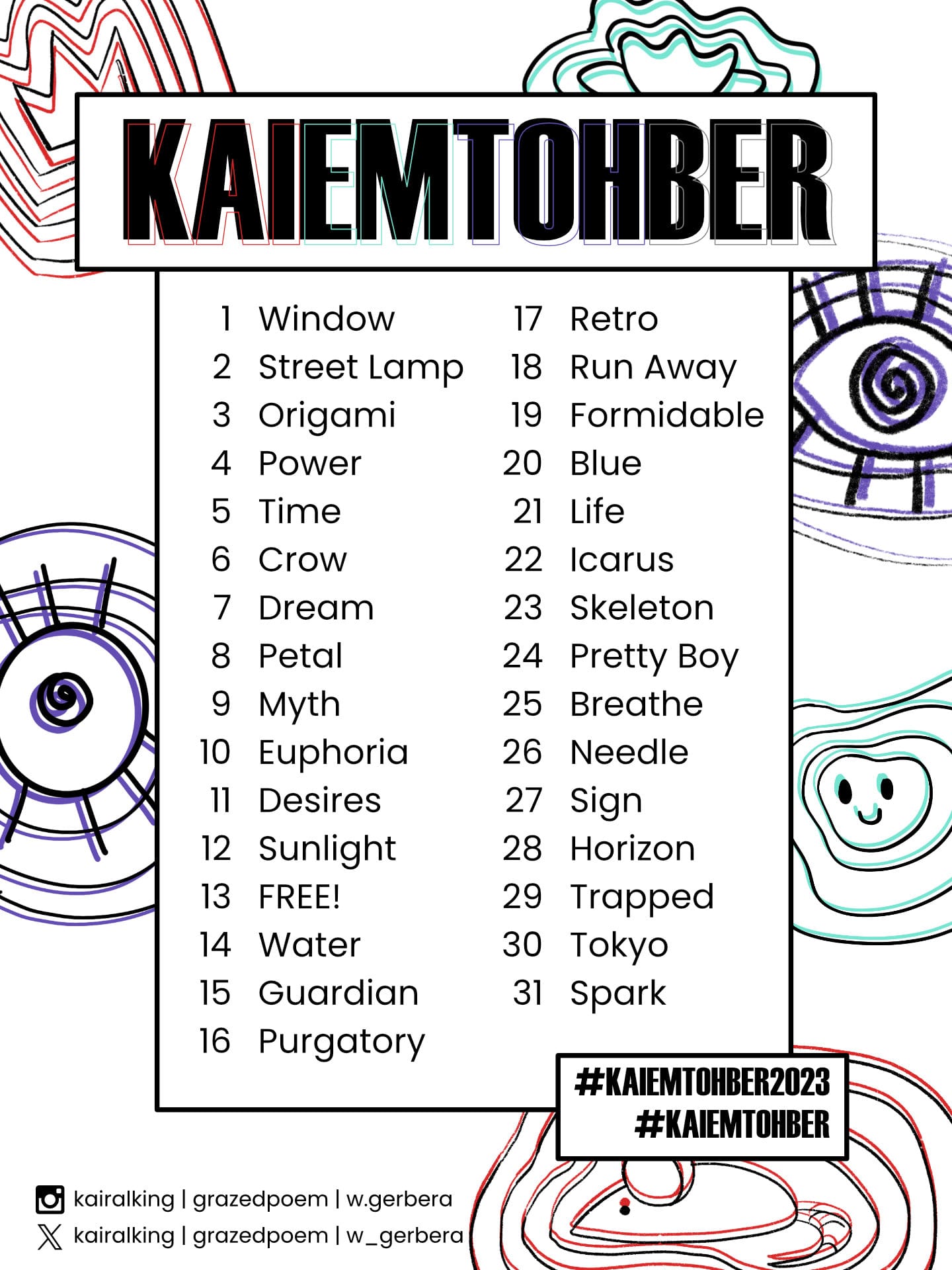 2023 KaiEmTohber promptlist poster designed for Twitter in landscape and portrait