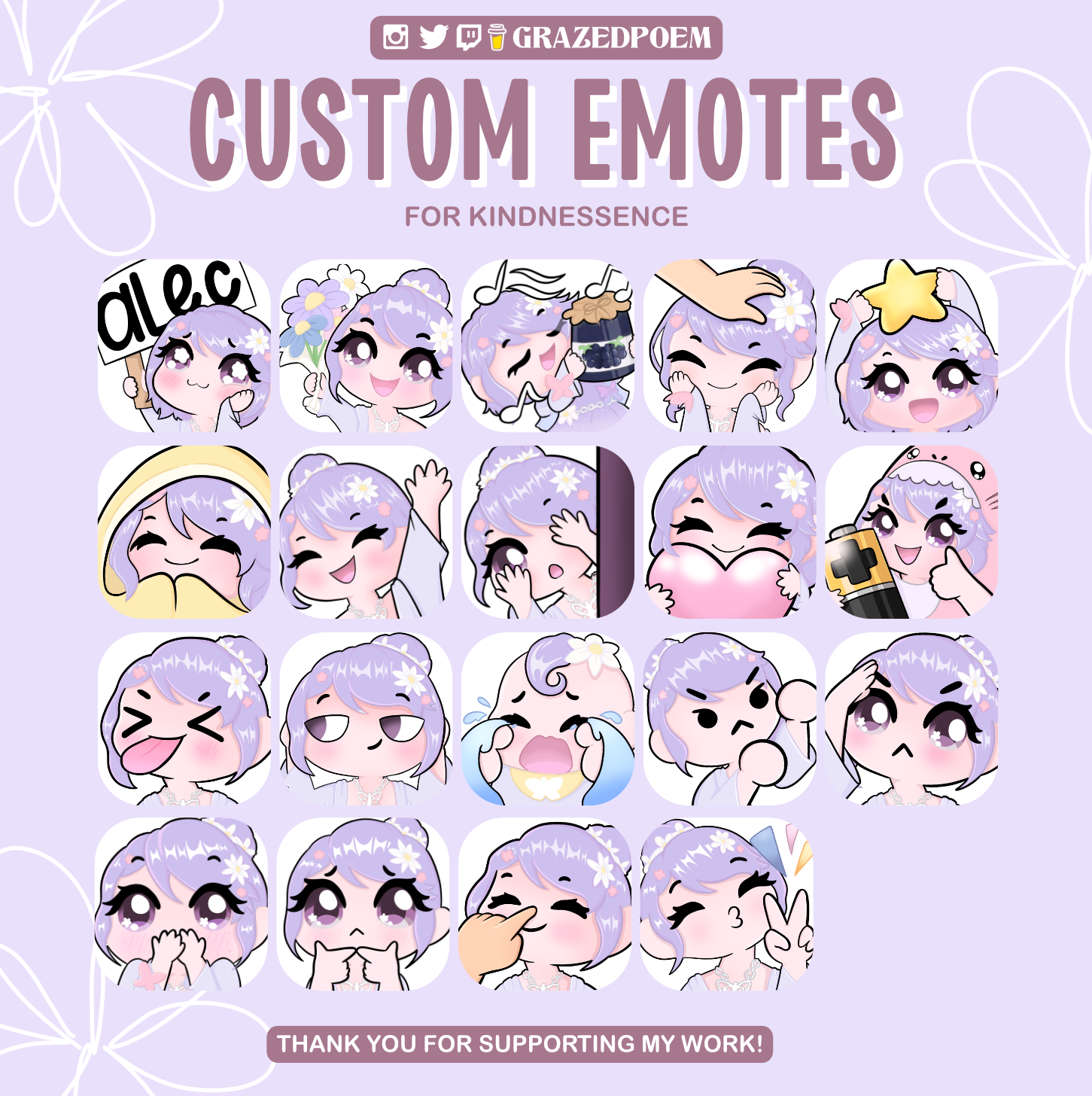 Emotes are an integral part of a Twitch and Discord community as it allows the members to express themselves through expressive images. Kindnessence streams with a PNGtuber character that represents her, hence, her emotes are of her character too.