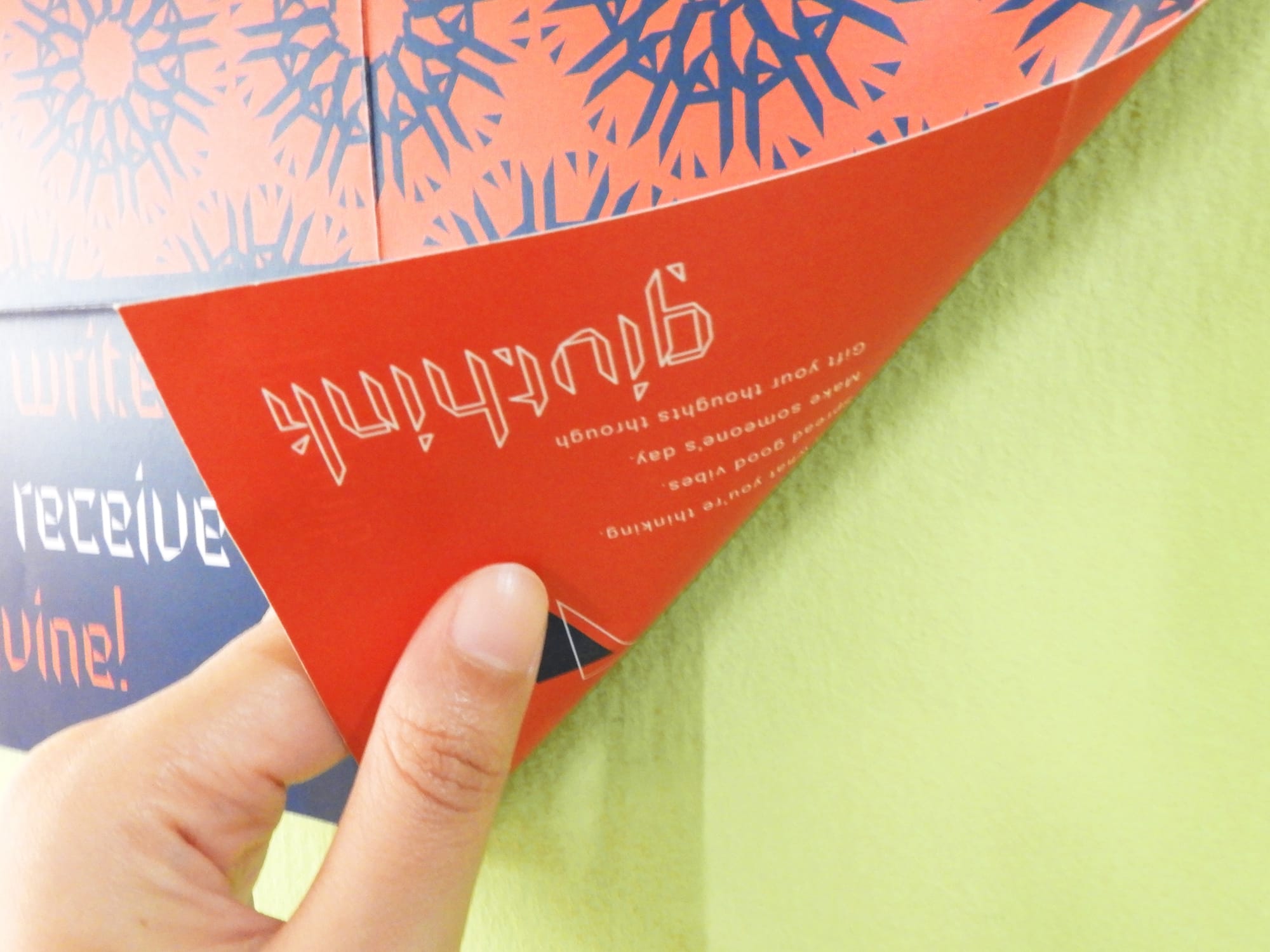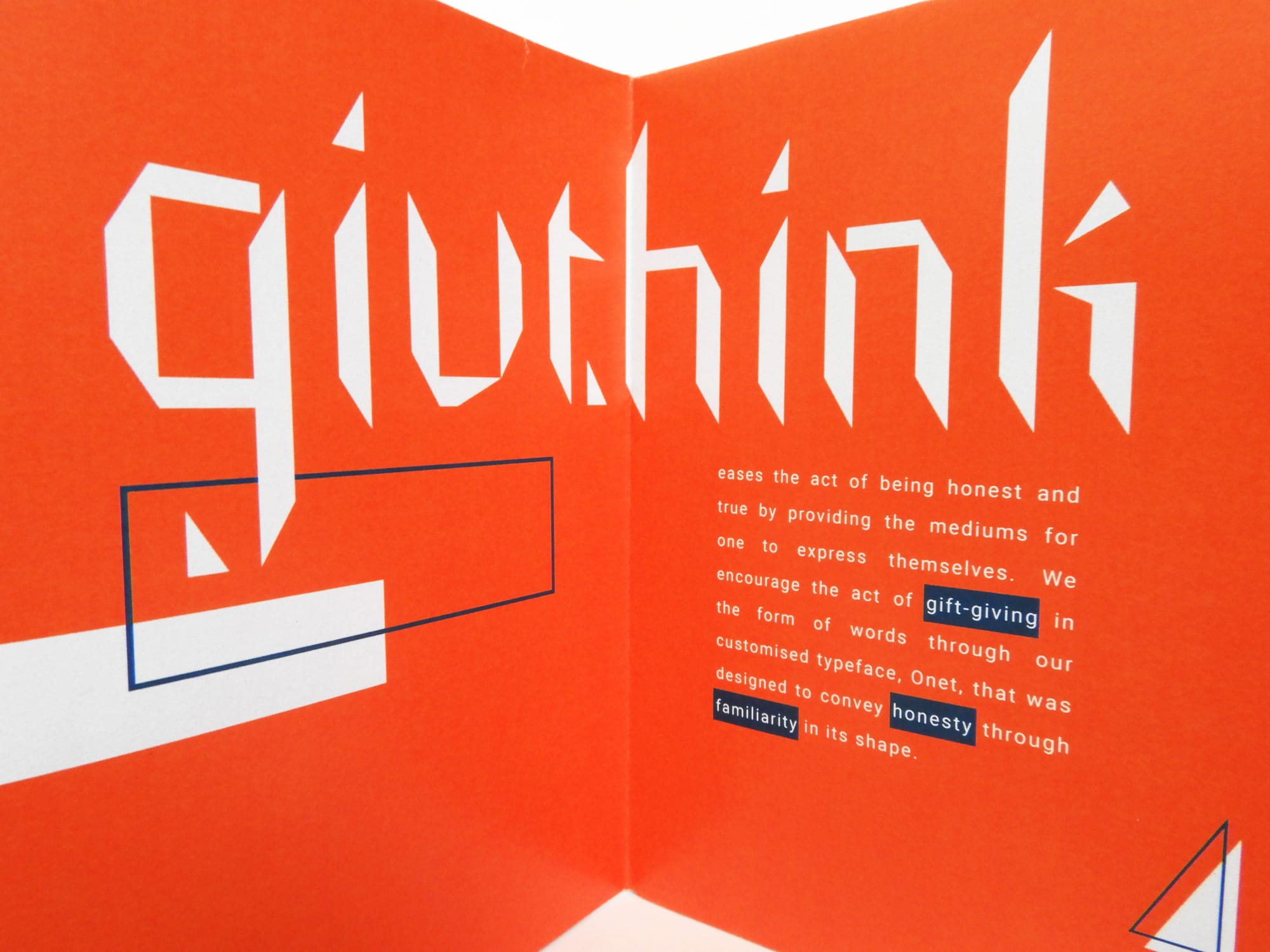 givthink eases the act of being honest and true by providing the mediums for one to express themselves. We encourage the act of gift-giving in the form of words through our customised typeface, Onet, designed to convey honesty through familiarity in its shape.