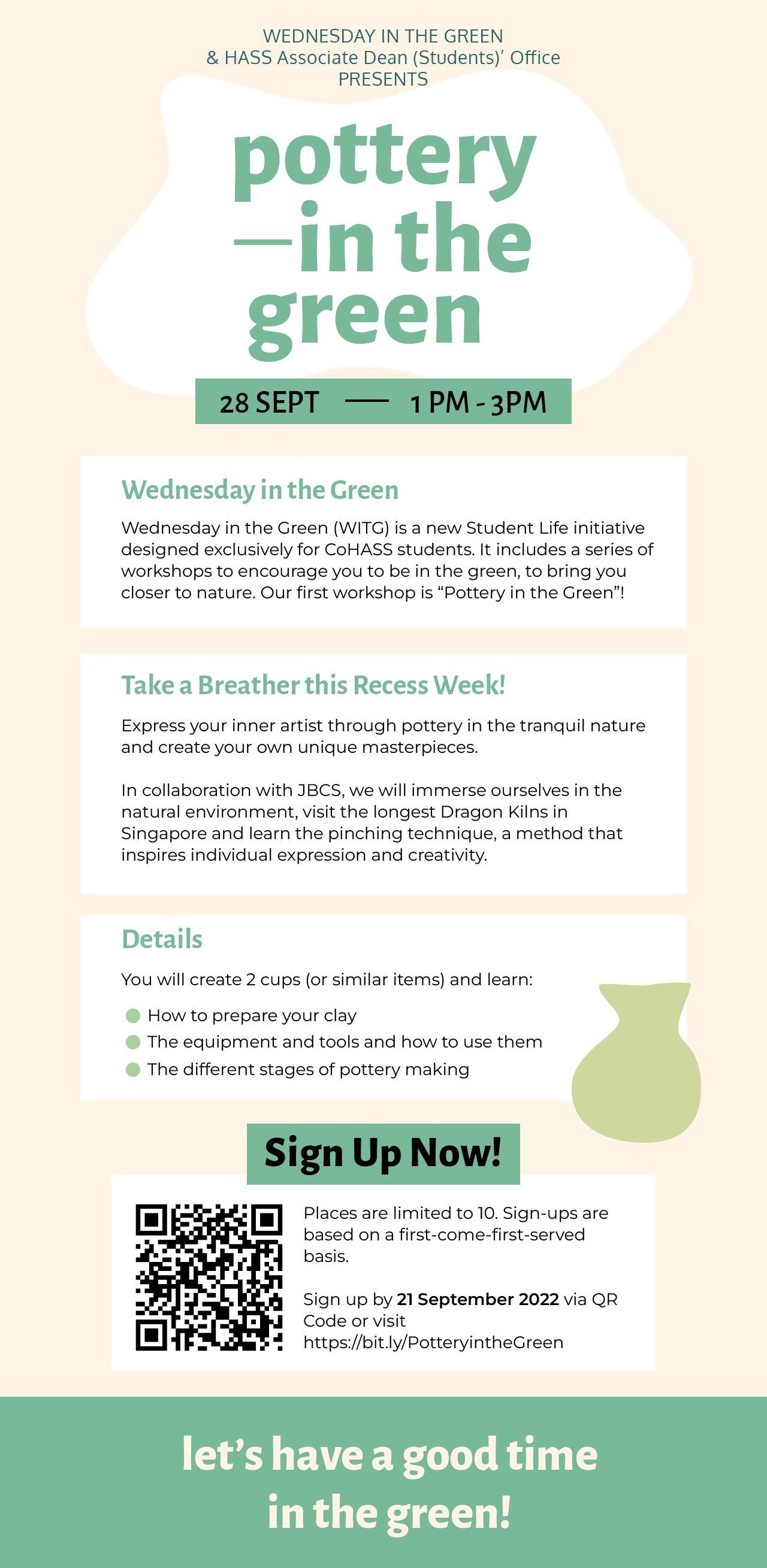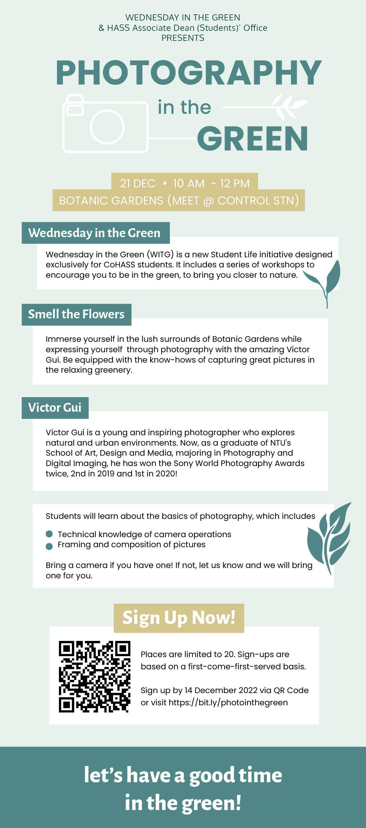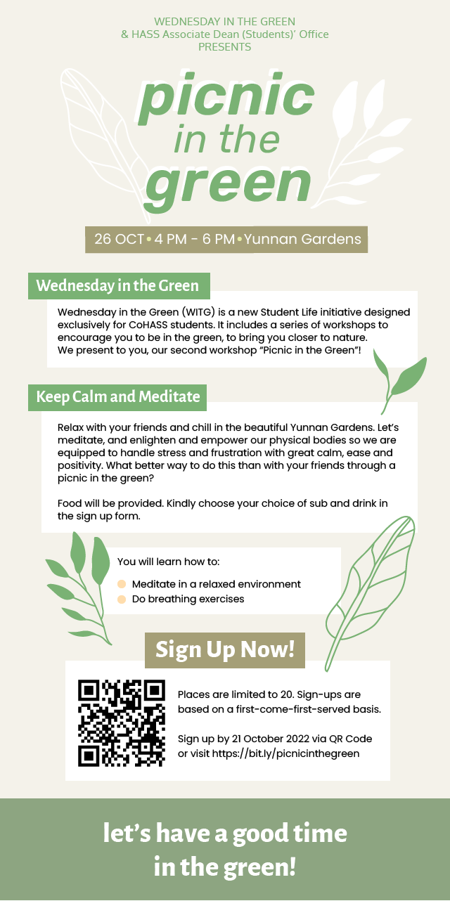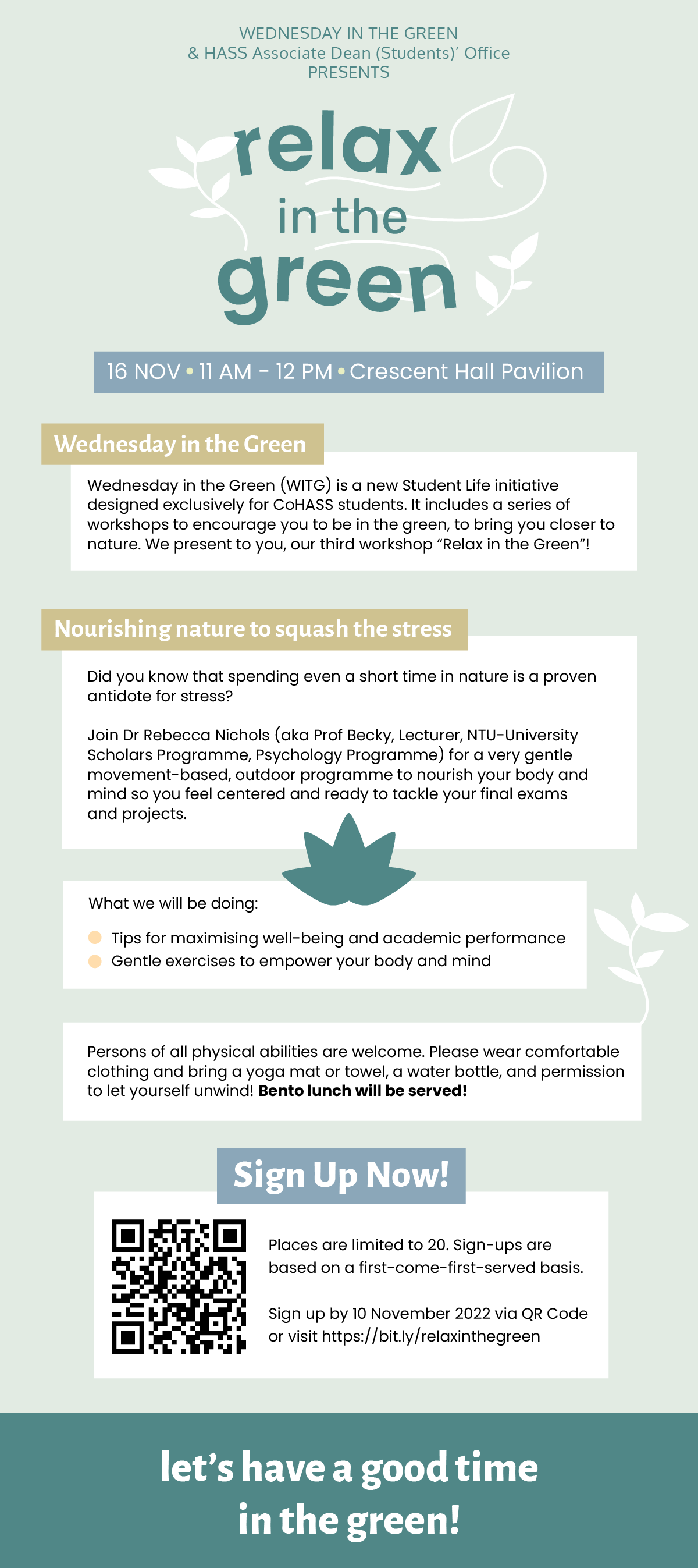 Wednesday in the Green is an initiative by Nanyang Technological University (NTU) for students under the Student Care Managers' (SCM) list, led by Professor Jesvin Yeo.