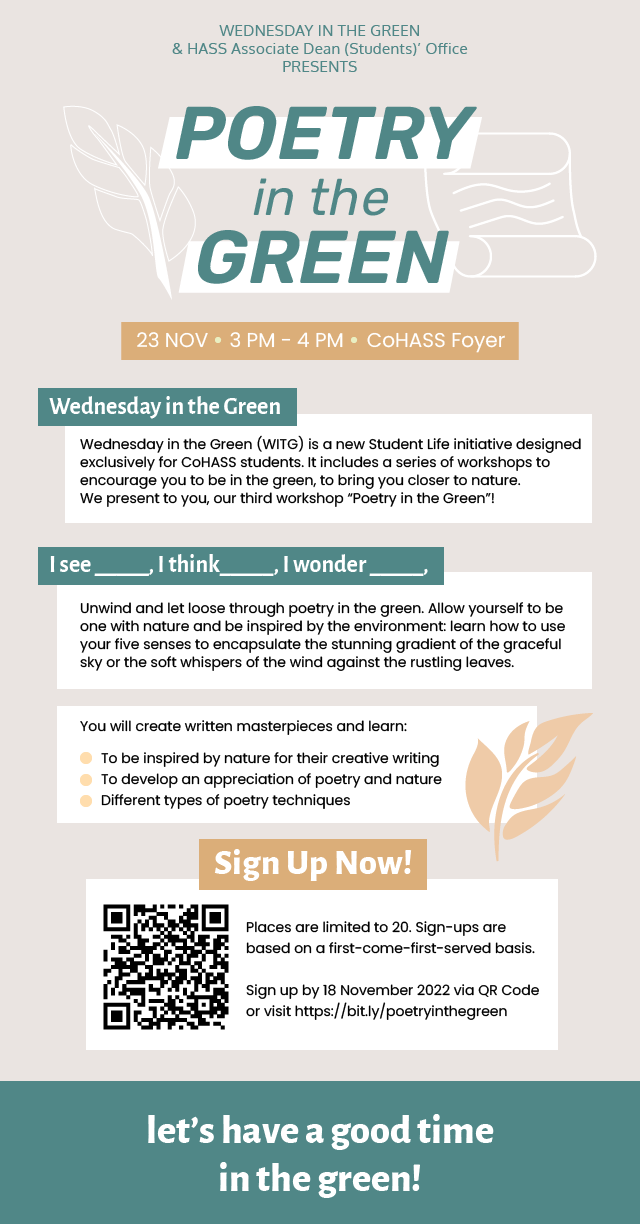 EDMs designed made use of a nature-esque colour palette and elements, making it easy on the eye and evoke warmth. Since it was a brand new project series, I took it in stride to ensure consistency in visuals and copywriting in the graphics and forms created, so as to show that the series of workshops are all under WITG.